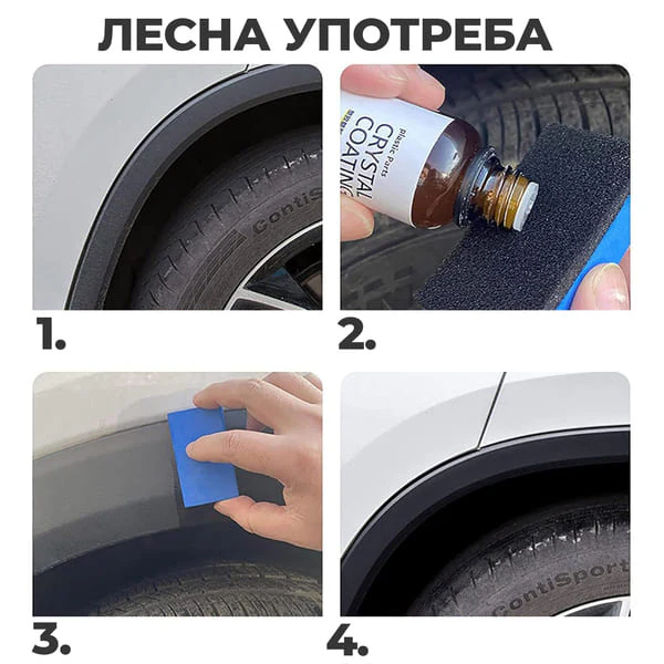 Прво добро се протресува шишенцето за да се соединат сите состојки. Потоа се користи апликатор или крпа и мала количина течност се нанесува на површината на пластиката во автомобилот што бара реставрација. По нанесувањето, течноста рамномерно се распоредува по површината со помош на апликатор или крпа.
